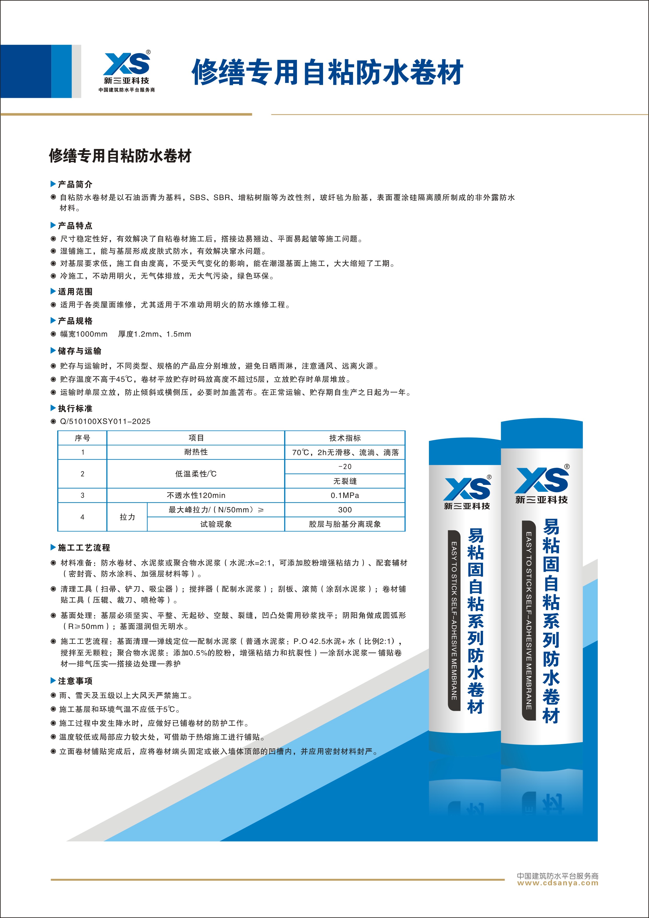 產(chǎn)品簡介 修繕專用自粘防水卷材是以石油瀝青為基料,SBS、SBR、增粘樹脂等為改性劑,玻纖氈為胎基,表面覆涂硅隔離膜所制成的非外露防水材料。 規(guī)格:1.5mm*10 m | ![]() |