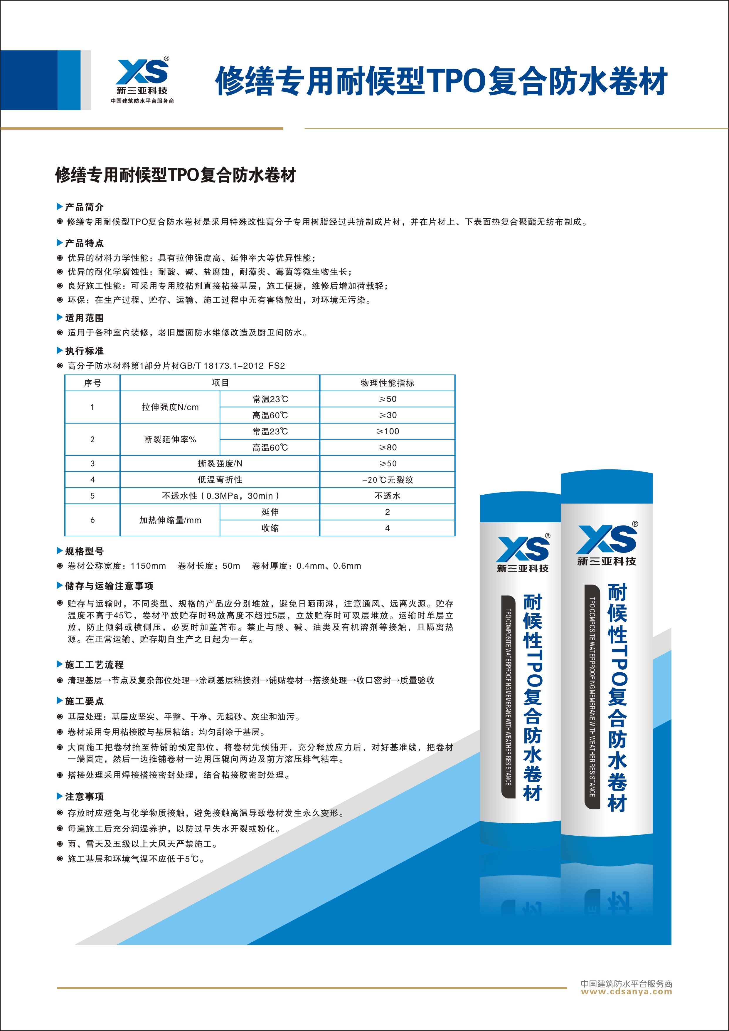 產(chǎn)品簡介: 修繕專用耐候型TPO復(fù)合防水卷材是采用特殊改性高分子專用樹脂經(jīng)過共擠制成片材,并在片材上、下表面熱復(fù)合聚酯無紡布制成。 規(guī)格:FS2-TPO-50.0m×1.15m×0.6mm | ![]() |