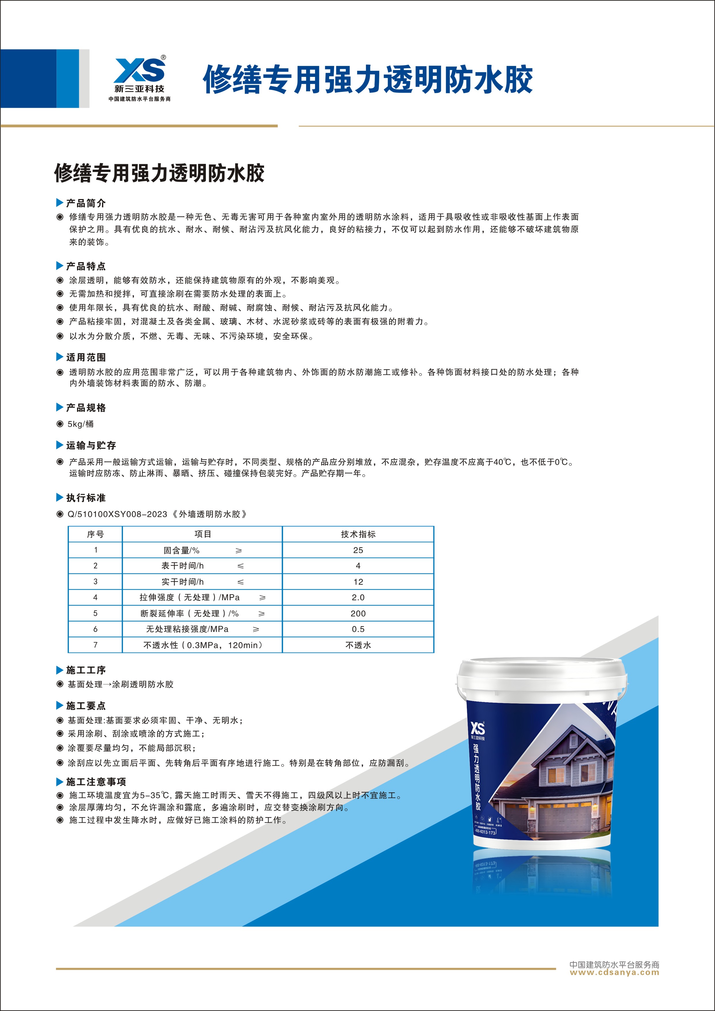 產品簡介: 修繕專用強力透明防水膠是一種無色、無毒無害可用于各種室內室外用的透明防水涂料,適用于具吸收性或非吸收性基面上作表面保護之用。具有優(yōu)良的抗水、耐水、耐候、耐沾污及抗風化能力,良好的粘接力,不僅可以起到防水作用,還能夠不破壞建筑物原來的裝飾。 規(guī)格:5kg/桶